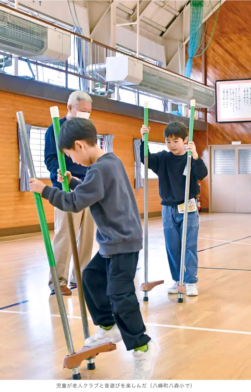 同町浜田地区老人クラブ(吉田輝男会長)のメンバー5人や、両者をつないだコミュニティースクールディレクターの工藤克弥さんが同校を訪れ”地域の先生”として遊び方を教えました。