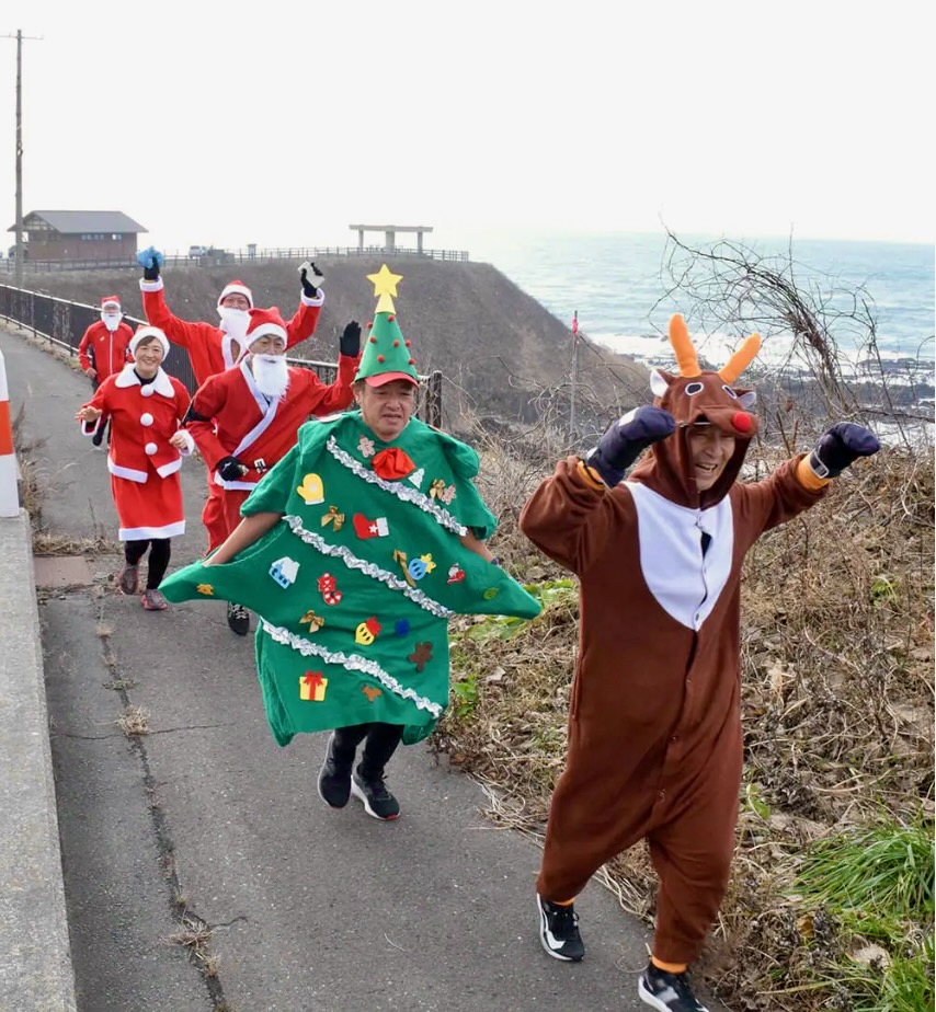 能代市内外のマラソン愛好者がクリスマスにちなんだ衣装を身に着けて、同市元町のJR能代駅から八峰町八森のハタハタ館まで約25キロを走る企画が20日行われた。