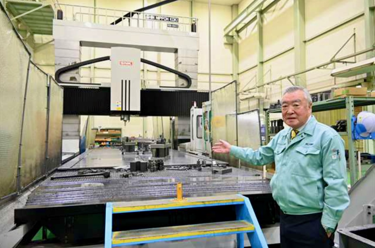 三栄機械会長の齊藤さん。後ろの金属加工機は洋上風力産業への参入を見据えて導入した