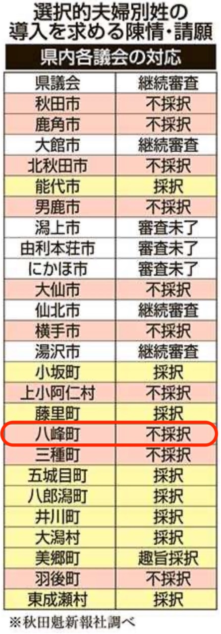 八峰町は不採択、つまり選択的夫婦別姓に反対だったんですね。