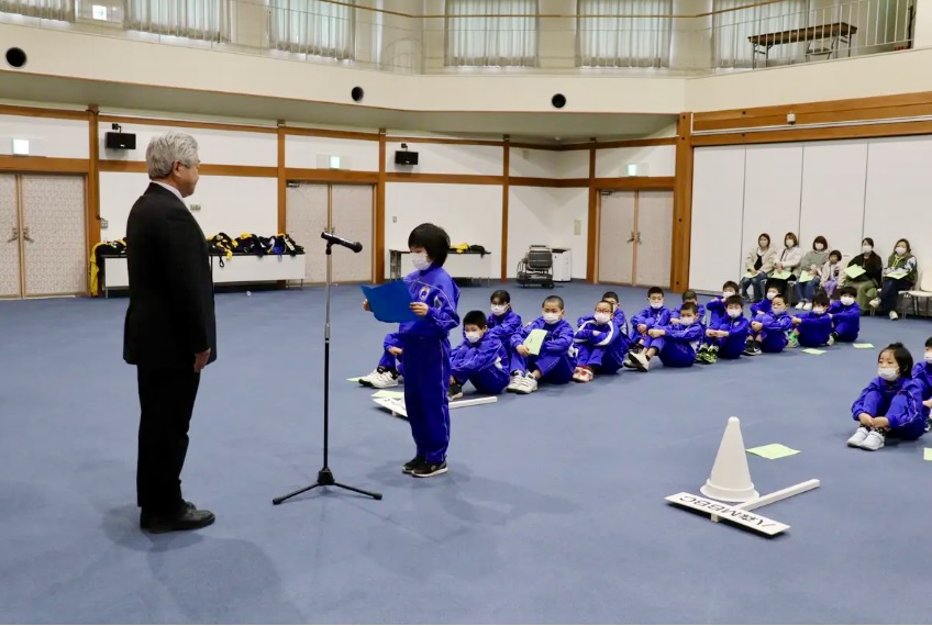 八峰町スポーツ少年団の合同入団式は20日、同町八森のファガスで行われ、団員たちは新年度も仲間と一緒にスポーツを通し自らの力を伸ばす努力をすることなどを誓いました。