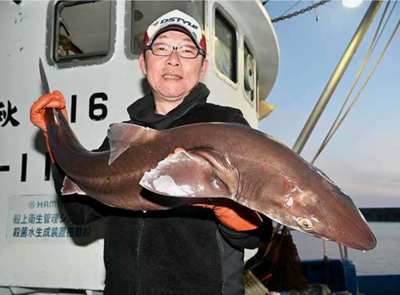 底引き網で獲ったアブラツノザメを持つ山本さん。大きな個体は全長1メートルを超える