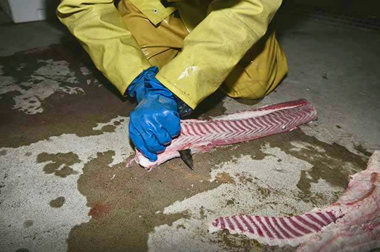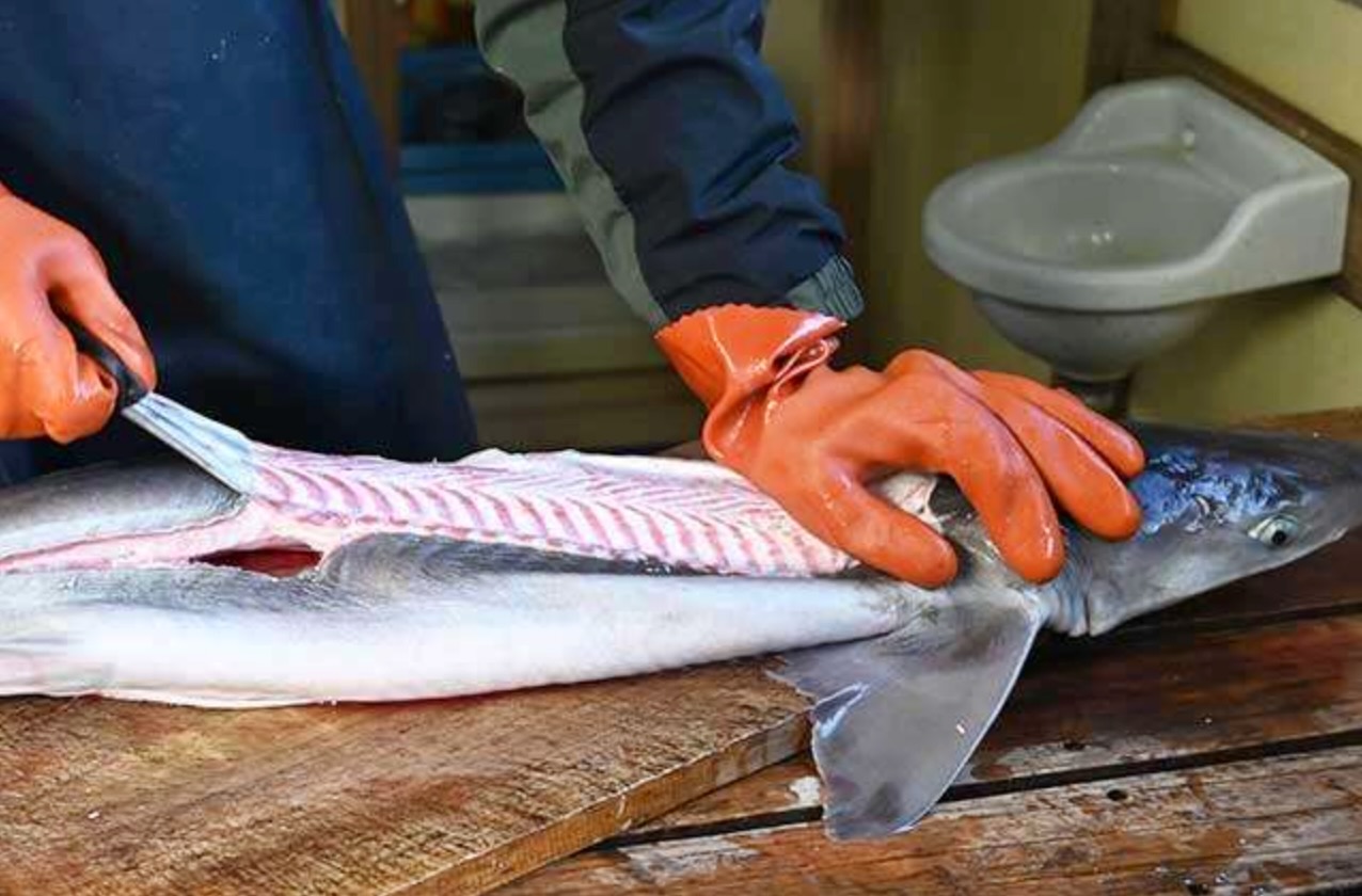 船上で内臓をしっかり洗うことで、サメ特有のアンモニア臭も抑えている。