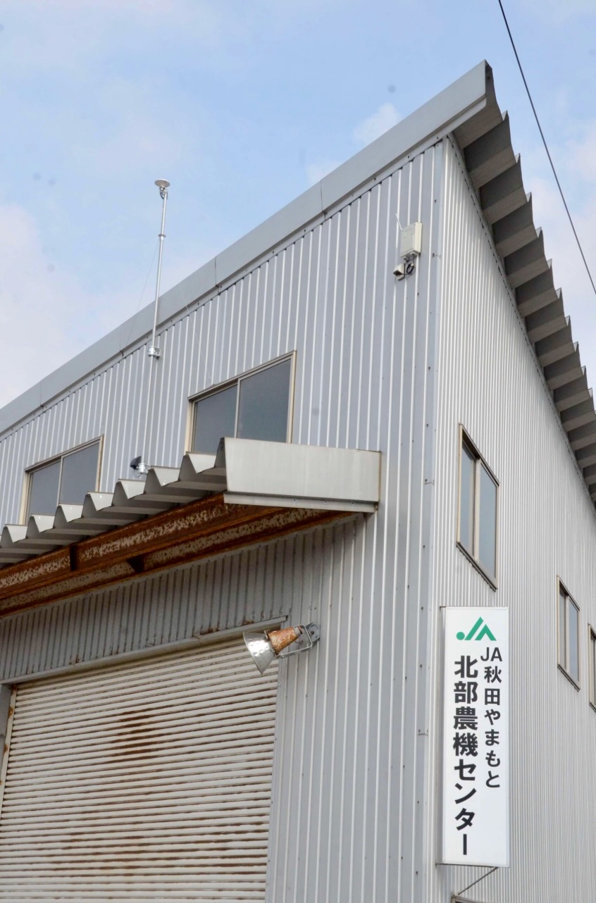 JA秋田やまもと・北部農機センターの工場壁面に設置されたRTK固定基地局のアンテナ(八峰町峰浜石川地内で